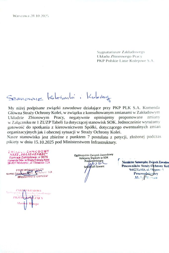 Pismo organizacji związkowych działających w Straży Ochrony Kolei do sygnatariuszy ZUZP PKP PLK S.A.